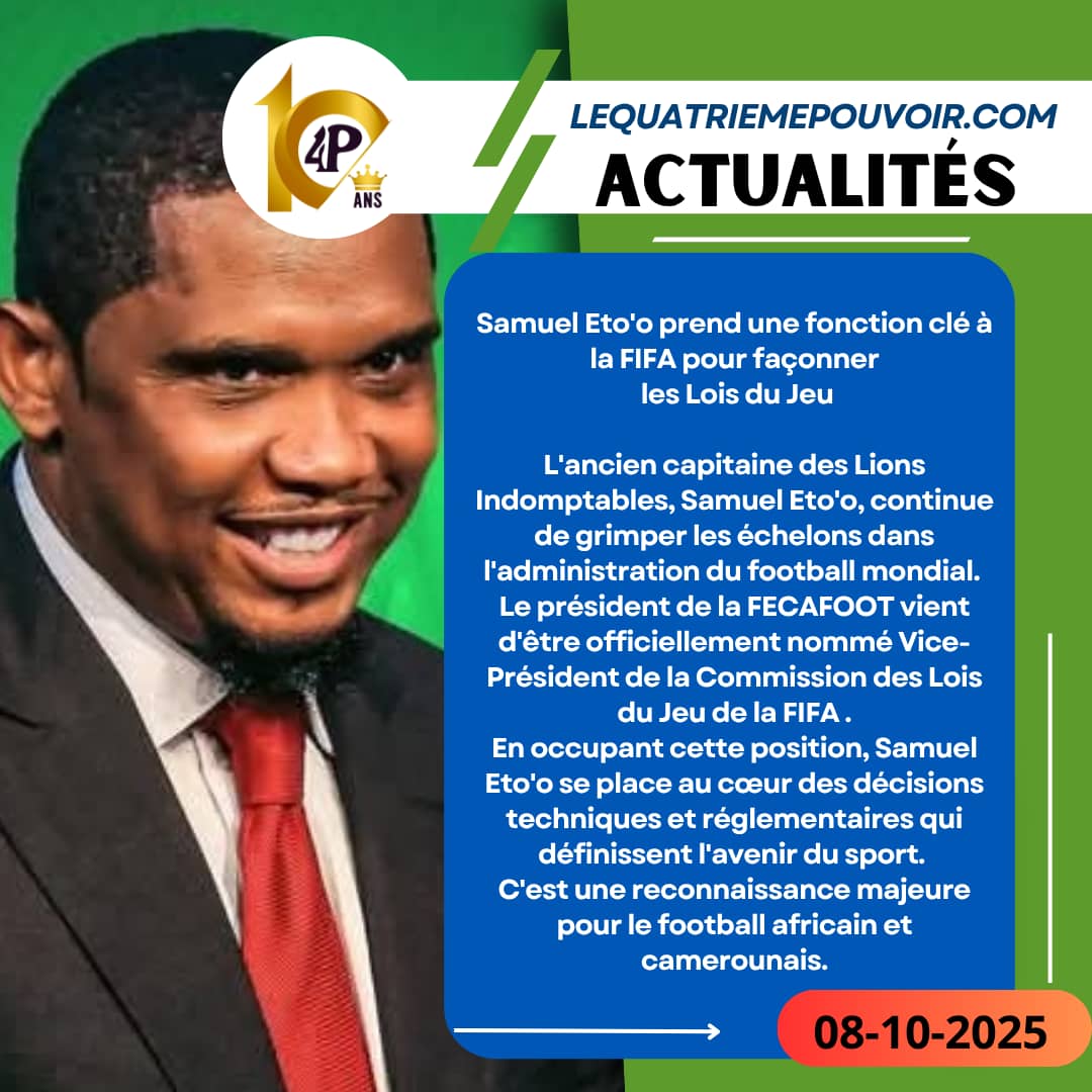 - Samuel Eto’o, légende du football et actuel président de la FECAFOOT, a été nommé vice-président de la Commission des Lois du Jeu.
