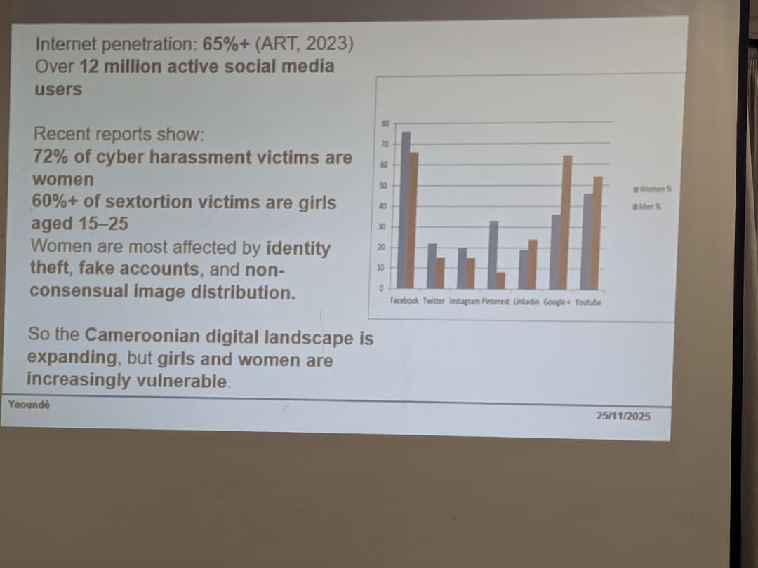 Selon les statistiques mondiales, entre 16 % et 58 % des femmes sont victimes de violence numérique, et 85 % ont été témoins ou victimes de harcèlement en ligne. Au Cameroun, ce fléau se manifeste notamment par le harcèlement, le pistage, l’usurpation d’identité et l’abus d’images ou de vidéos sur les réseaux sociaux. Les femmes visibles en ligne : journalistes, militantes, politiciennes , sont particulièrement exposées, mais toutes sont concernées.