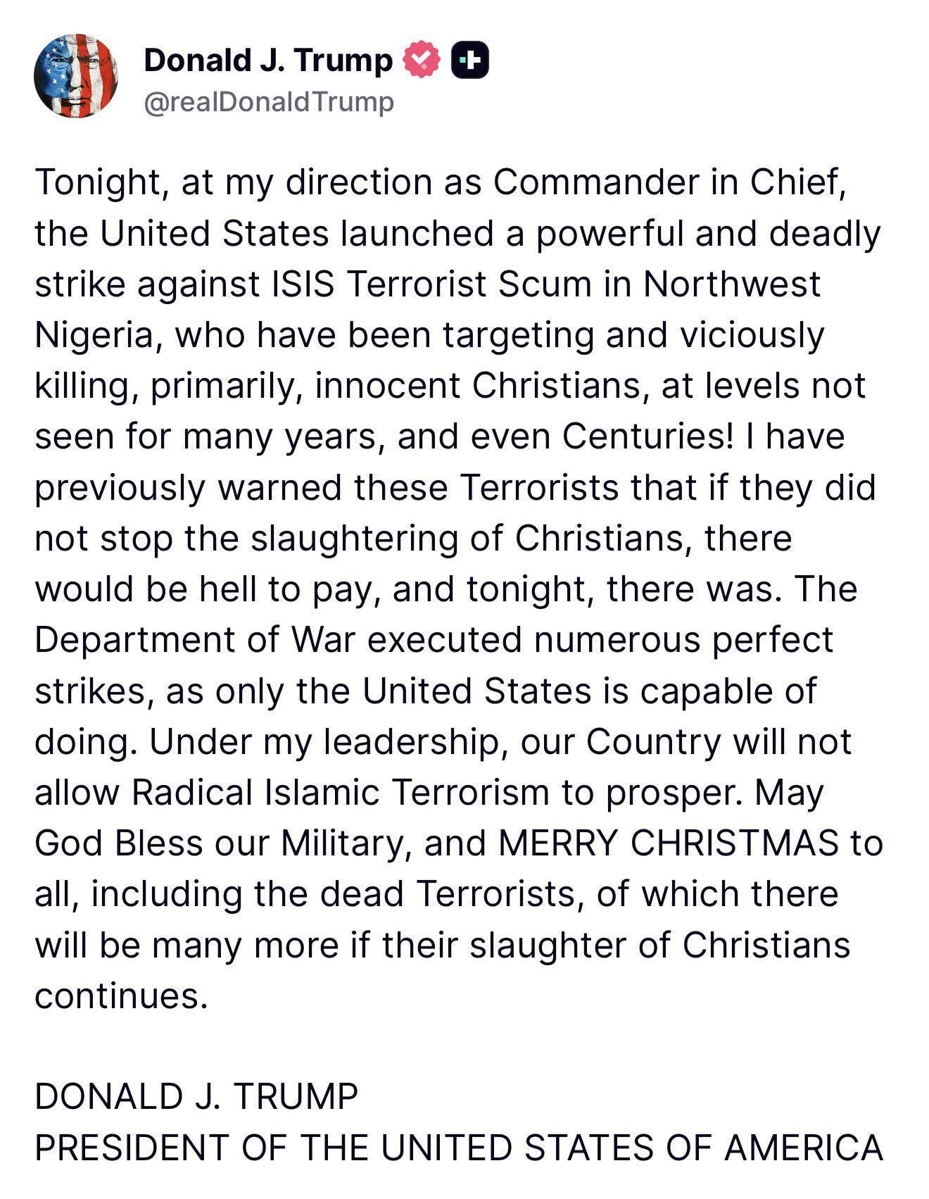 Le message, publié sur la plateforme Truth Social ce jeudi 25 décembre, est sans ambiguïté. Donald Trump y confirme que les États-Unis ont lancé une attaque « puissante et meurtrière » dans le nord-ouest du Nigeria. « J’avais prévenu ces terroristes que s’ils n’arrêtaient pas le massacre de chrétiens, ils allaient le payer cher. Ce soir, ils ont payé », a-t-il déclaré, qualifiant les frappes réalisées par le « ministère de la Guerre » de « parfaites ».